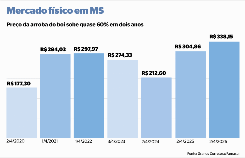 Após um período prolongado de preços pressionados, a arroba do boi gordo voltou a ultrapassar o patamar de R$ 330 em Mato Grosso do Sul, acumulando alta de 10% em 12 meses. Dados da Granos Corretora, sem a incidência do Funrural, mostram que a cotação saiu de R$ 304,86, em abril de 2025, para R$ 338,15, em abril deste ano.