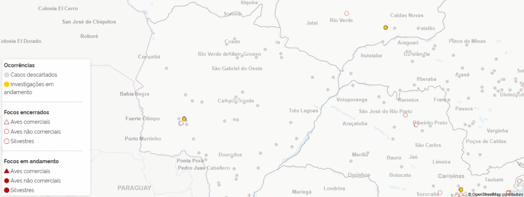 Em 2026, o cenário nacional soma 200 investigações de suspeitas de Síndrome Respiratória e Nervosa das Aves, das quais 87 exigiram coleta de amostras para análise laboratorial. Atualmente, há oito investigações em andamento sem resultado conclusivo. Neste ano, foram confirmados dois focos de influenza aviária de alta patogenicidade no Brasil.