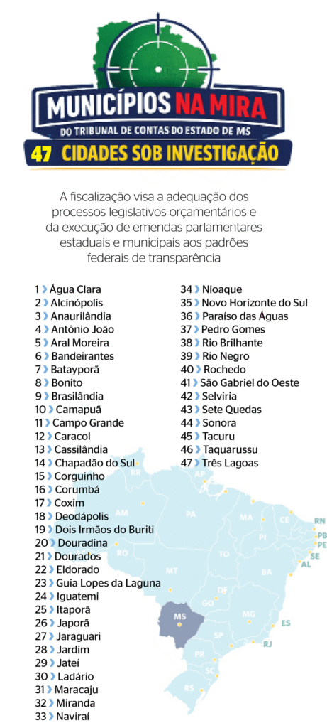 “Pela intimação dos prefeitos dos municípios de Anaurilândia, Aral Moreira, Bandeirantes, Batayporã, Bonito, Chapadão do Sul, Corguinho, Deodápolis, Dois Irmãos do Buriti, Douradina, Guia Lopes da Laguna, Iguatemi, Itaporã, Japorã, Jaraguari, Jardim, Jateí, Ladário, Miranda, Naviraí, Nioaque, Novo Horizonte do Sul, Pedro Gomes, Rio Brilhante, Rio Negro, Selviria, Sete Quedas, Sonora, Tacuru, Taquarussu e Três Lagoas para que remetam os documentos e as informações relacionados, consoante o art. 13-A da Resolução TCE/MS nº 266/2025”, detalhou a decisão do conselheiro.