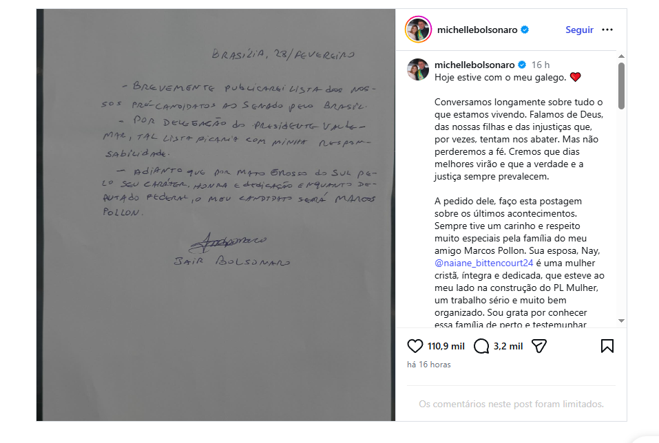 O ex-presidente Jair Bolsonaro (PL) escreveu carta de próprio punho, afirmando que o deputado Marcos Pollon é candidato ao Senado em Mato Grosso do Sul. O texto foi publicado neste sábado (28), por Michelle Bolsonaro, nas redes sociais.