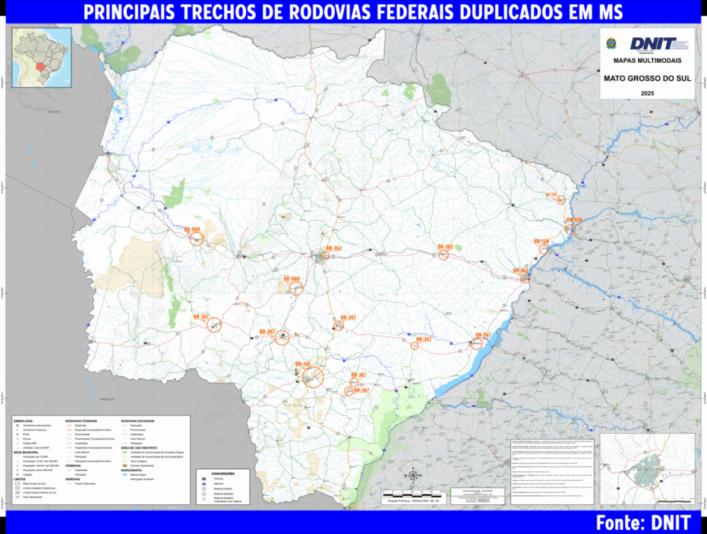 Considerando a extensão federal duplicada (veja principais trechos no mapa acima) no estado em relação à malha total, Mato Grosso do Sul, de acordo com dados do SNV, tem o oitavo pior índice do país.