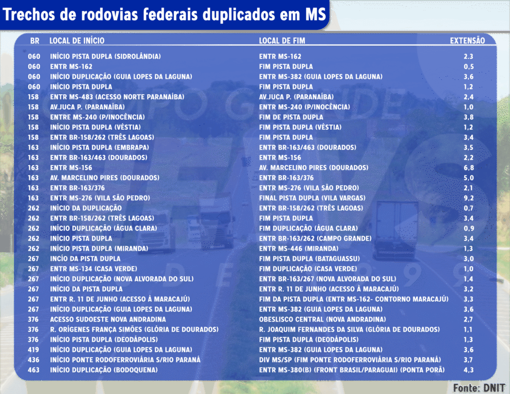 A extensão com pista dupla de jurisdição do estado é pouco menor do que a distância da Capital sul-mato-grossense ao município de Sidrolândia, cerca de 70 quilômetros.