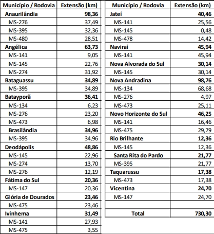 Tabela com trechos do Rodar MS, municípios e extensão da malha rodoviária