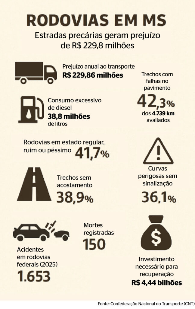 Os transportadores de carga em Mato Grosso do Sul tiveram prejuízos  de R$ 229,86 milhões no ano passado por causa da má qualidade das rodovias no Estado, apontam estudos da Confederação Nacional do Transporte (CNT).